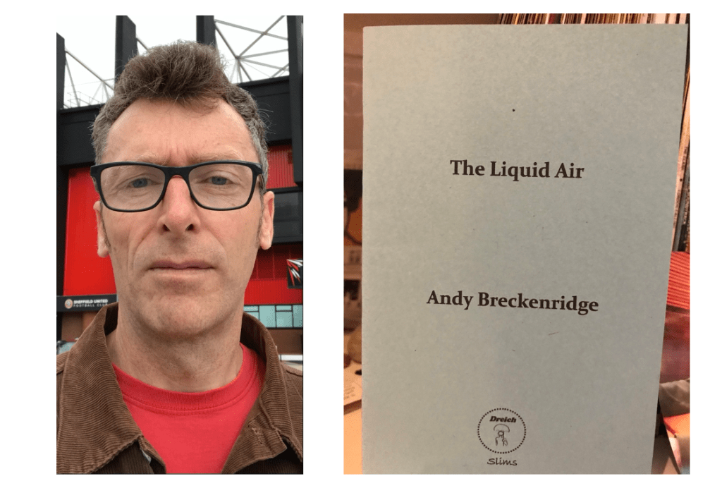 Andy Breckenridge is an English teacher living in Brighton, via London, Paris and Glasgow, but is originally from Oban in Argyllshire. His debut pamphlet, The Liquid Air, was published by Dreich in Jul 2021. He won the East Sussex County Council poetry prize in 2005, and has also had work published in the Common Breath poetry blog, Nutmeg Magazine (the Scottish Football Periodical), Stanza’s Poetry Map of Scotland and the Shoreham Wordfest Anthology 2020. Poems are due out in Dreich’s Summer Anywhere anthology, and in The Best Worst Years by Acid Bath Publishing. He is currently editing his first collection.