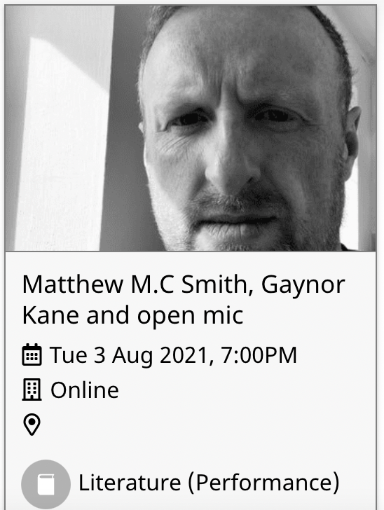 On Tuesday 3rd August, at 7pm, Gaynor Kane (Venus In Pink Marble) and Black Bough Poetry creator Matthew MC Smith (Origins: 21 poems) headline at the Cheltenham Poetry Festival online with tickets available at https://cheltenhampoetryfestival.co.uk/